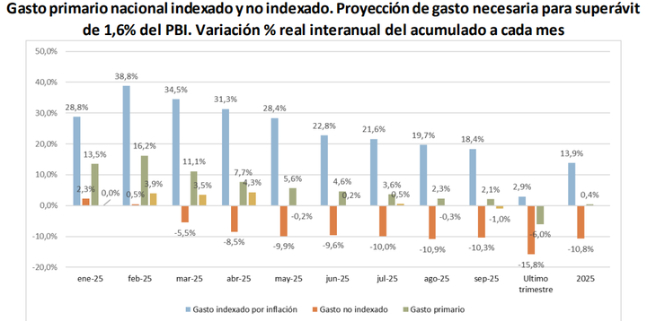 La entidad sostiene que ese tipo de erogaciones venía bajando en 2025 a un ritmo del 10% real interanual, y ahora “debería bajar un 16% real interanual en el último trimestre del año”.