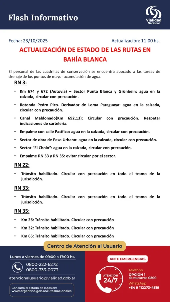 Vialidad Nacional emitió un comunicado en el que solicita circular con precaución por todas las rutas cercanas a la Bahía Blanca por presencia de agua en la calzada.