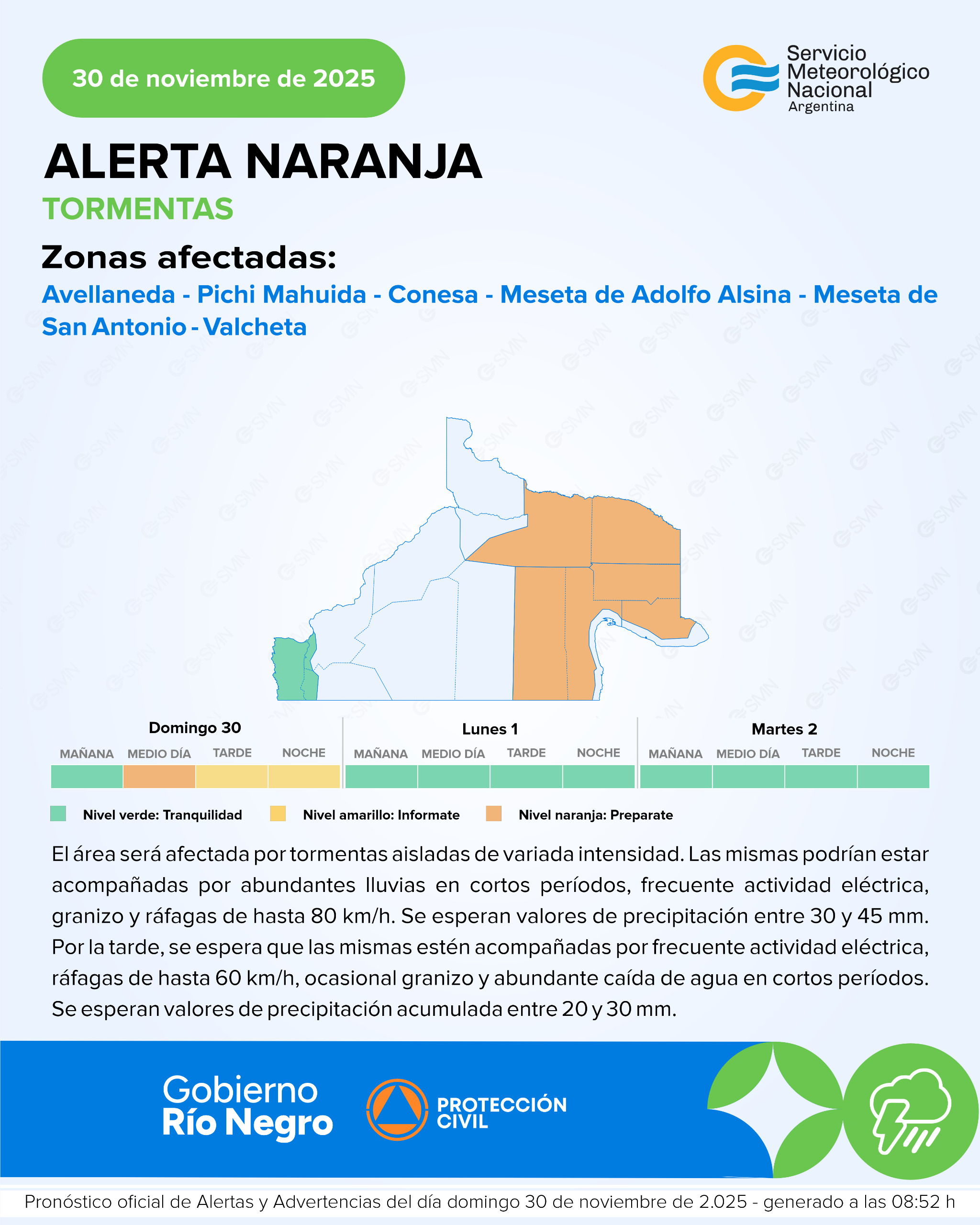 El área será afectada por tormentas aisladas de variada intensidad. Las mismas podrían estar acompañadas por abundantes lluvias en cortos períodos, frecuente actividad eléctrica, granizo y ráfagas de hasta 80 km/h. Se esperan valores de precipitación entre 30 y 45 mm. Por la tarde, se espera que las mismas estén acompañadas por frecuente actividad eléctrica, ráfagas de hasta 60 km/h, ocasional granizo y abundante caída de agua en cortos períodos. Se esperan valores de precipitación acumulada entre 20 y 30 mm.