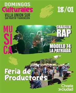 La primera jornada tendrá lugar en Villa Unión Sur, en la intersección de San Martín y Namuncurá, donde desde las 17 horas se instalará la Feria de Productores locales, con una amplia variedad de elaboraciones artesanales y productos regionales. Más tarde, el espacio se transformará en escenario para la música y el baile, con la apertura del ciclo Domingos Culturales.