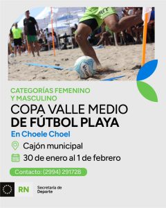 Choele Choel vuelve a ser punto de encuentro deportivo regional con la realización de la Copa Valle Medio de Fútbol Playa, un certamen que reunirá a equipos femeninos y masculinos de distintas localidades del Valle Medio y la región.