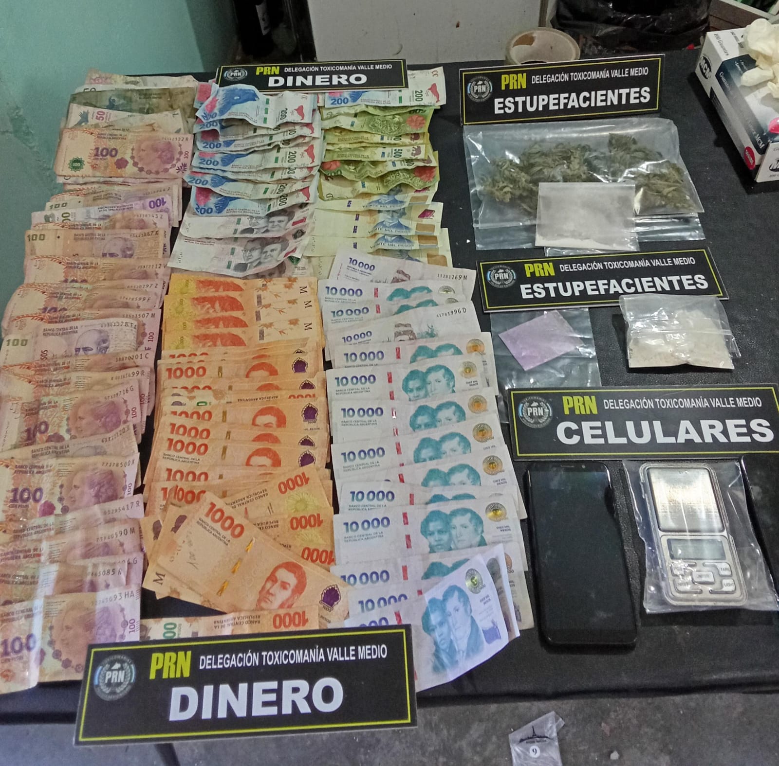 En el marco de las diligencias realizadas, se procedió a secuestrar: Clorhidrato de cocaína fraccionada, Cannabis Sativa (Marihuana), un envoltorio de nylon conteniendo sustancia polvorienta color violeta (que será enviada a laboratorio), balanza de precisión, teléfonos celulares y dinero en efectivo.