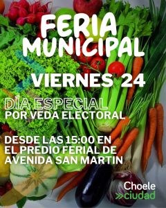 Debido a la veda electoral que comenzará el próximo fin de semana, la tradicional Feria de Productores, Artesanos y Emprendedores de Choele Choel cambiará su día habitual. En lugar del domingo, se realizará este viernes 24 de octubre a partir de las 15 horas, en el predio de Avenida San Martín.