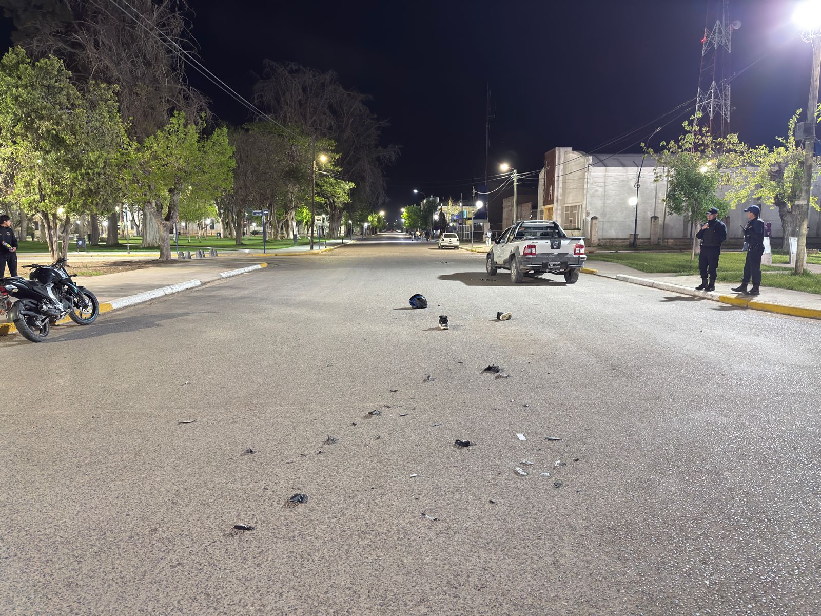 El siniestro involucró a una pick-up Fiat Strada, conducida por una mujer de 69 años, oriunda de Choele Choel, que circulaba por calle Rivadavia en sentido este-oeste, y una motocicleta Zanella FZ 150 cc, manejada por un joven de 18 años, domiciliado en Lamarque, quien transitaba por calle Sarmiento con dirección suroeste-noroeste.