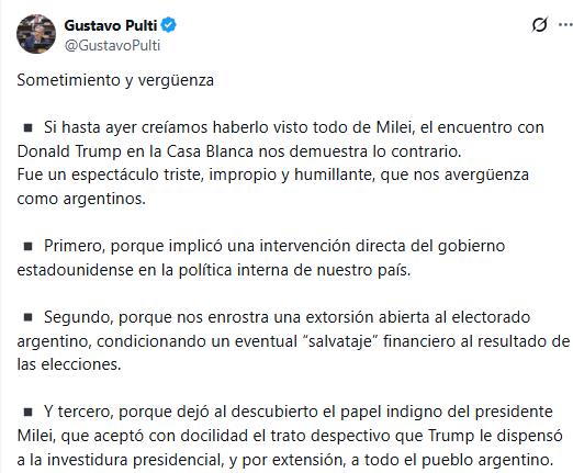 En primer término, el diputado bonaerense de Unión por la Patria, Gustavo Pulti, indicó que el encuentro de Milei con Trump en la Casa Blanca “fue un espectáculo triste, impropio y humillante, que nos avergüenza como argentinos”. “Implicó una intervención directa del gobierno estadounidense en la política interna de nuestro país”, añadió.