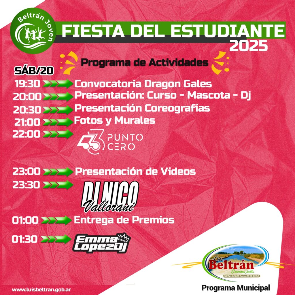 La Fiesta del Estudiante si bien se desarrolla durante gran parte del año, encuentra su jornada de cierre en septiembre. Para este 2025 la fiesta propiamente dicha, se llevará a cabo el proximo sabado 20 desde las 19:00 horas aproximadamente.