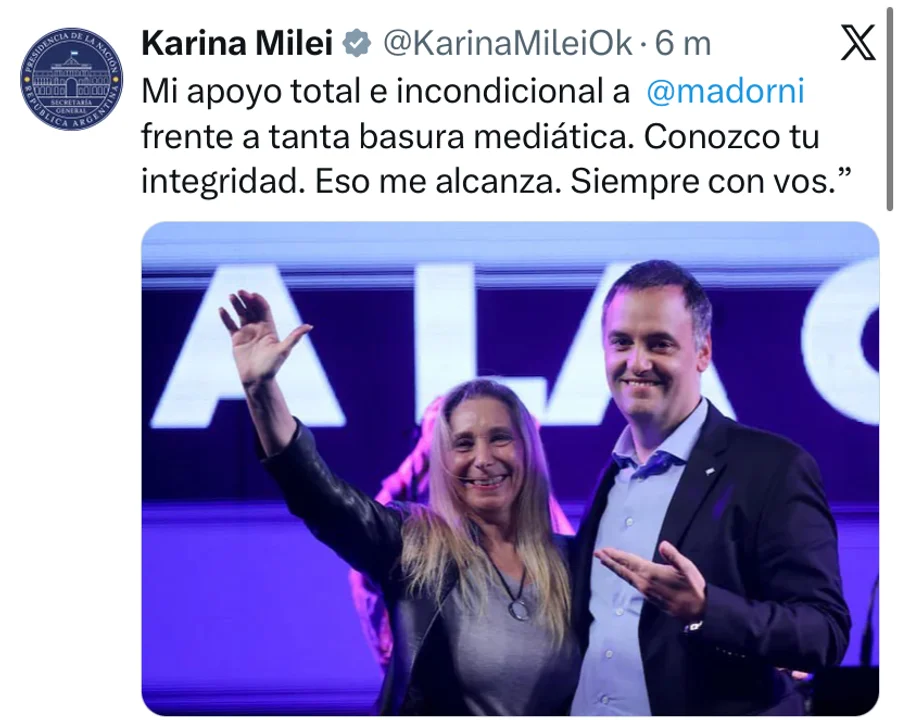 En la misma línea, la secretaria general de la presidencia y titular del partido libertario a nivel nacional, Karina Milei, expresó su “apoyo total e incondicional” con el funcionario. “Frente a tanta basura mediática, conozco tu integridad, eso me alcanza, siempre con vos”, subrayó El Jefe en las redes sociales.