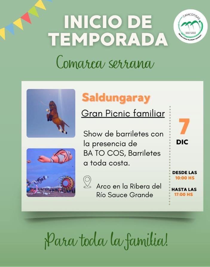 * Domingo 7 de diciembre, Saldungaray (desde las 10 hs): show de barriletes, picnic comunitario, feria de artesanos y productores, y espectáculo de malabaristas.