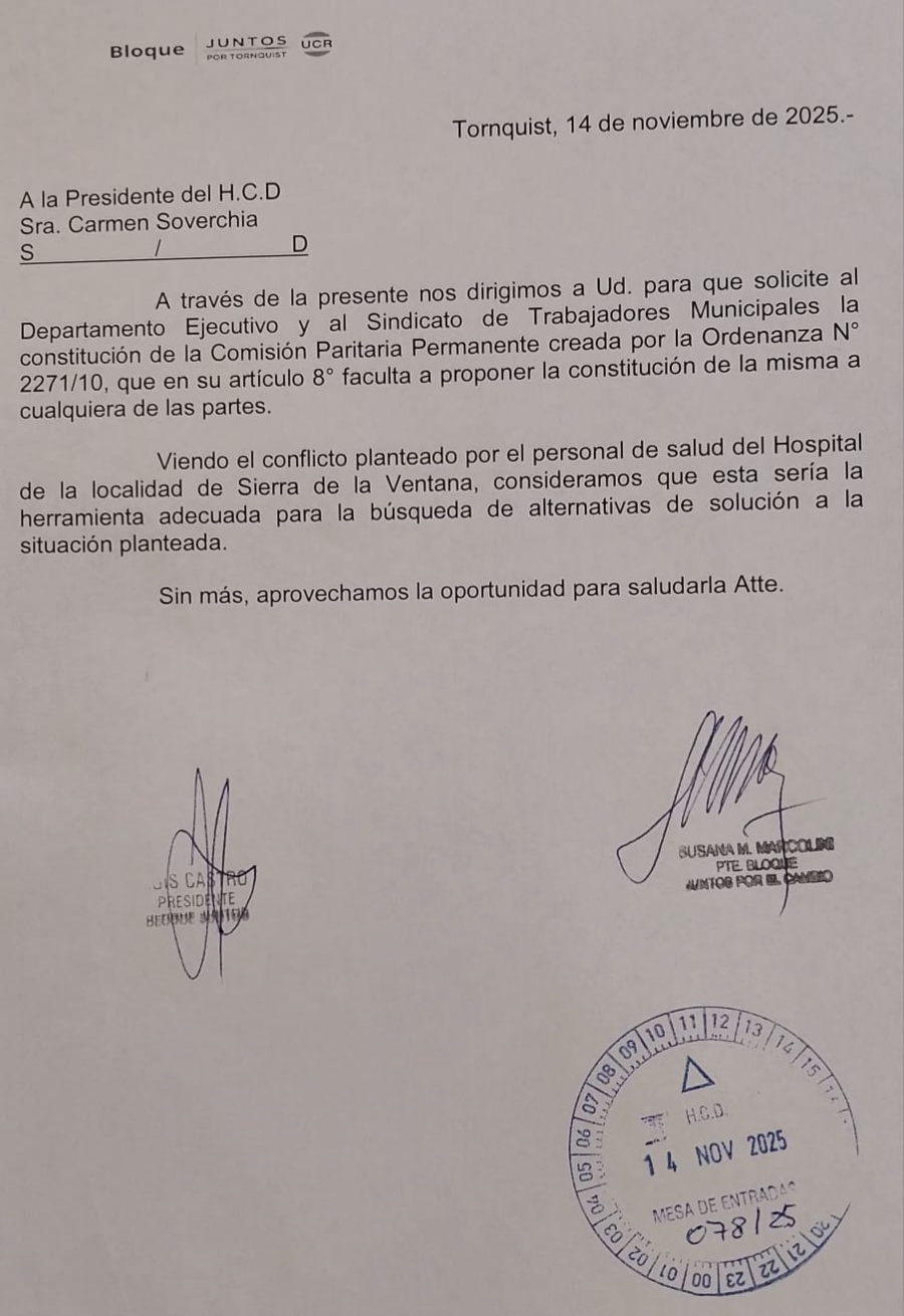 El Bloque de Concejales Juntos UCR de Tornquist se dirige a la Presidencia del H.C.D., Sra. Carmen Soverchia, para solicitar la constitución de una Comisión Paritaria Permanente como herramienta para buscar soluciones al conflicto con el personal de salud del Hospital de Sierra de La Ventana.