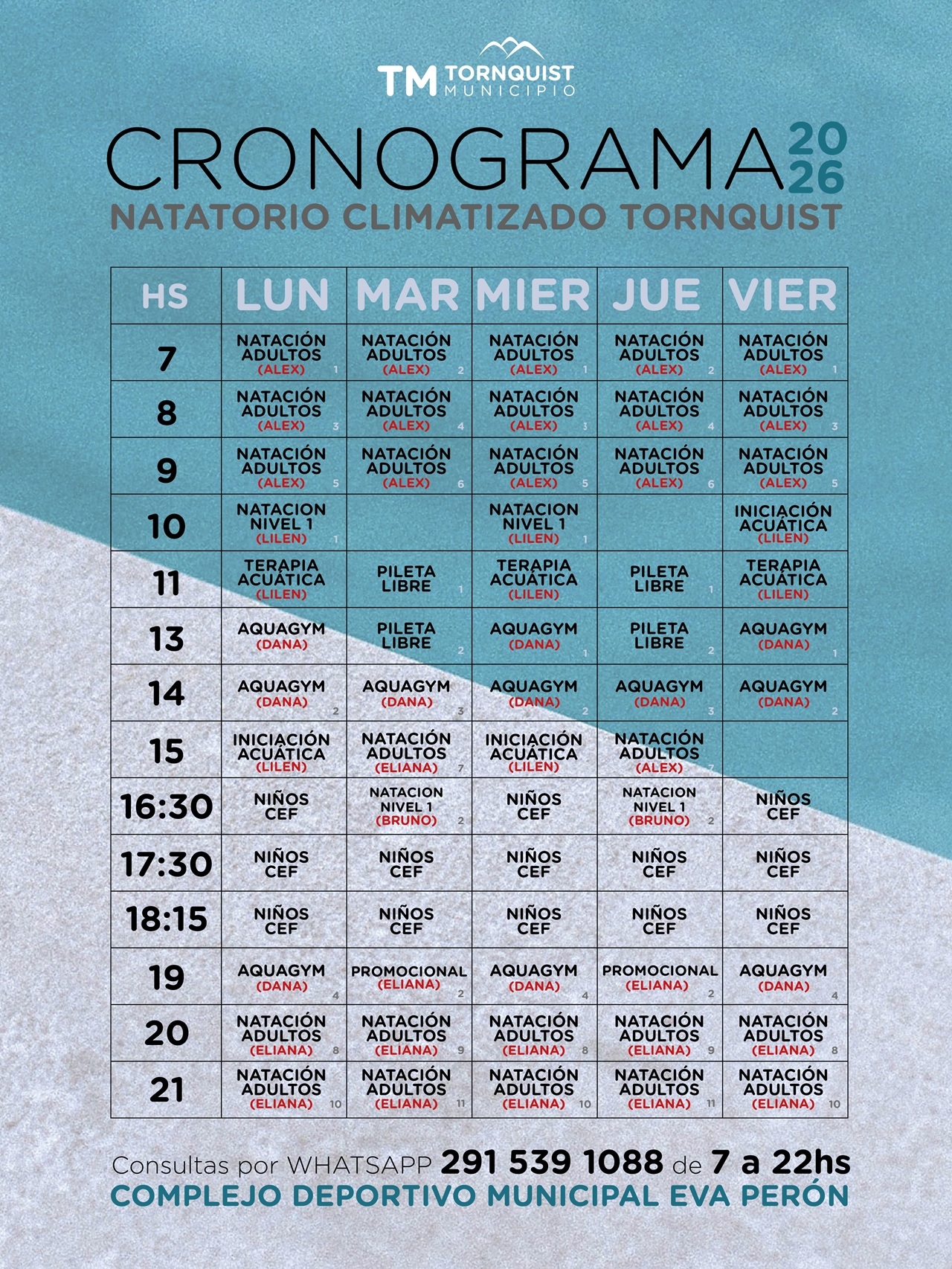 Las personas interesadas podrán inscribirse comunicándose por WhatsApp al 2915391088 o de manera presencial en el natatorio, de lunes a viernes, de 8 a 12 y de 17 a 21 hs.
