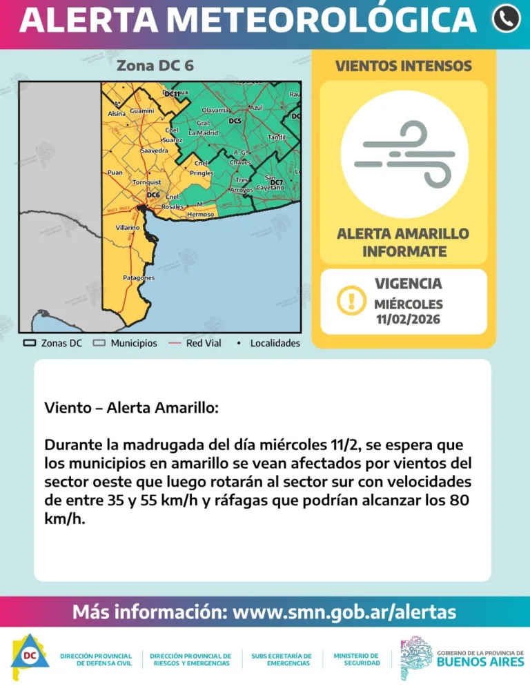 Precisaron que el área, además, será afectada por vientos del sector oeste que luego rotarán al sur con velocidades de entre 35 y 55 km/h y ráfagas que podrían alcanzar los 80 km/h durante la noche del martes y madrugada del miércoles.