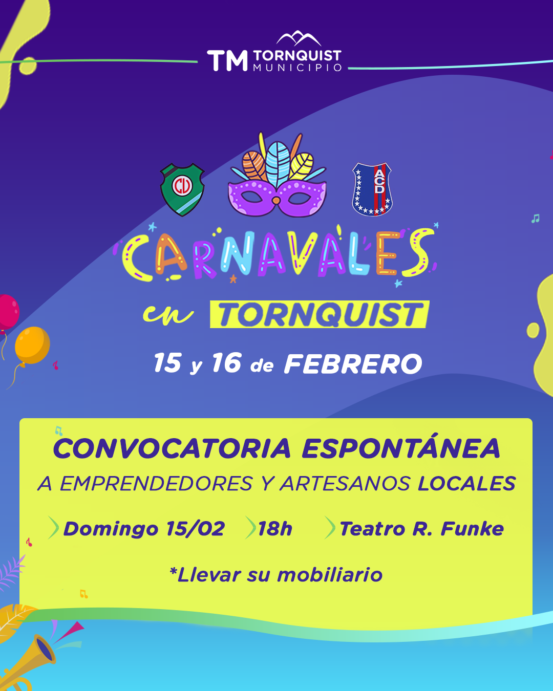 La Subsecretaría de Cultura informa que se encuentra abierta la convocatoria destinada a emprendedores y artesanos locales que deseen participar en los Carnavales de Tornquist, que se llevarán a cabo los días 15 y 16 de febrero.