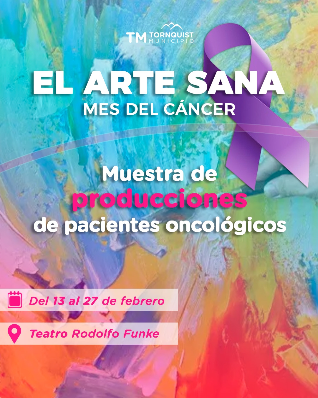 TORNQUIST: El Arte Sana «Se viene una muestra muy especial en el Teatro Municipal»  Desde este viernes 13 y hasta el 27 de febrero, en el Teatro Municipal “Rodolfo Funke”, se encontrará abierta una muestra artística muy especial: producciones realizadas por pacientes oncológicos del distrito.