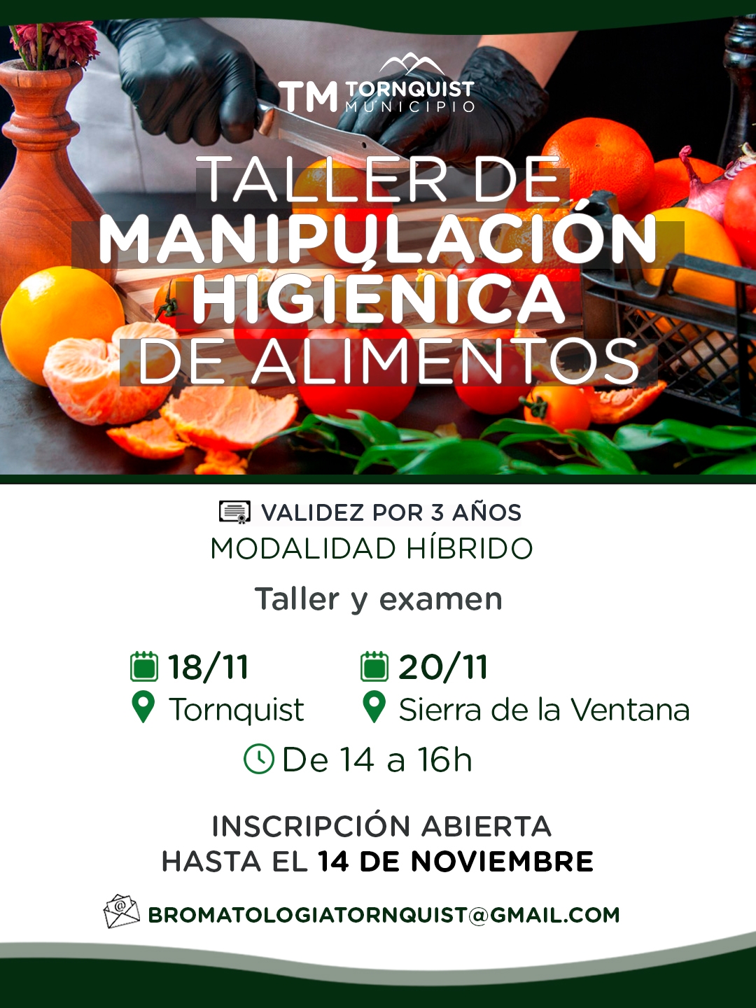 TORNQUIST: El municipio lanzó un nuevo Taller de Manipulación Higiénica de Alimentos  La Subsecretaría de Bromatología y Zoonosis de Tornquist Municipio, lanzó un nuevo taller de Manipulación Higiénica de Alimentos, a realizarse en dos fechas.
