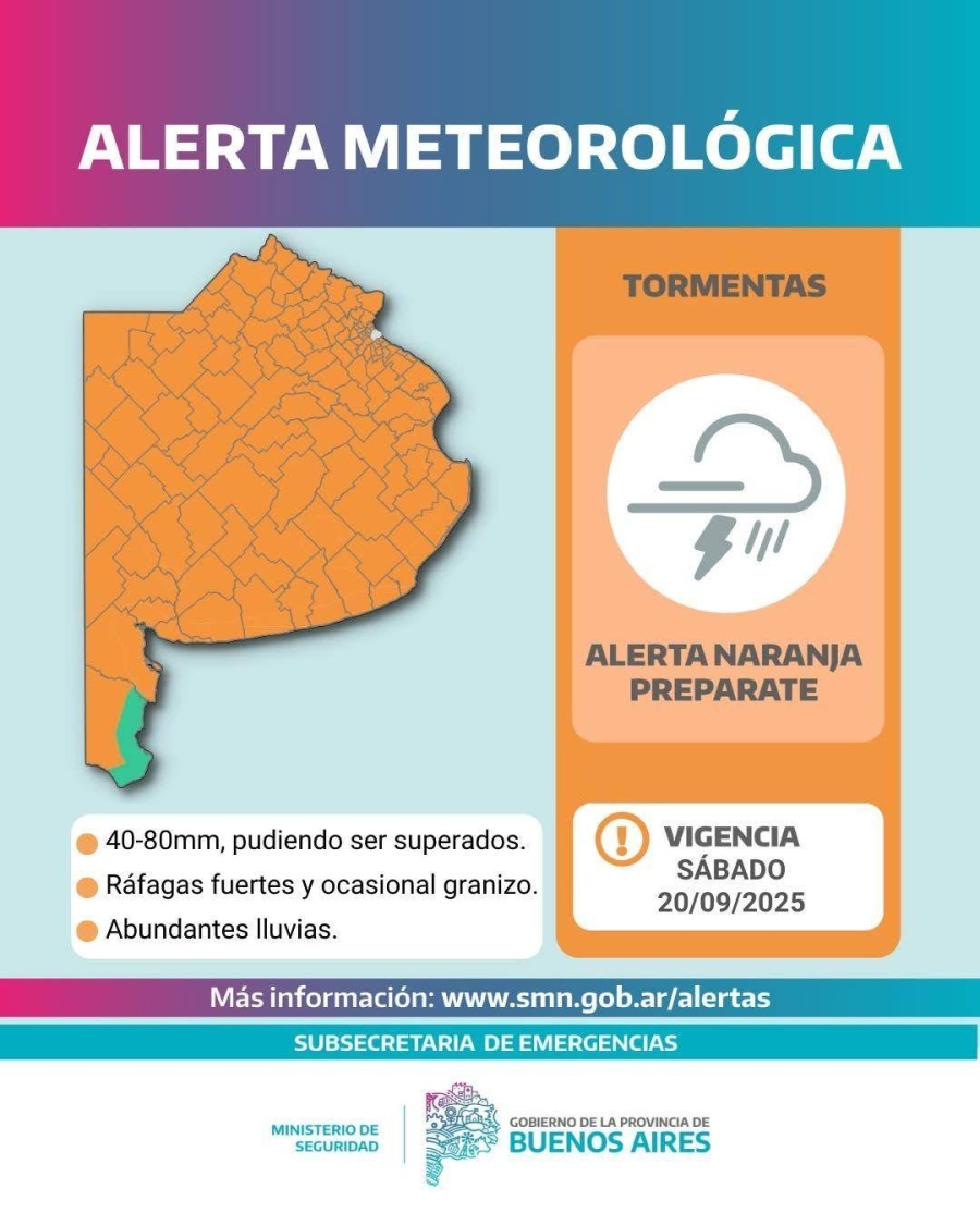 Además se pueden registrar ráfagas fuertes de forma localizada y no se descarta la caída de granizo pequeño de manera aislada. Hacia el final de la tarde y la noche, se prevé una disminución en la intensidad de los fenómenos quedando la zona con lluvias y lloviznas remanentes.