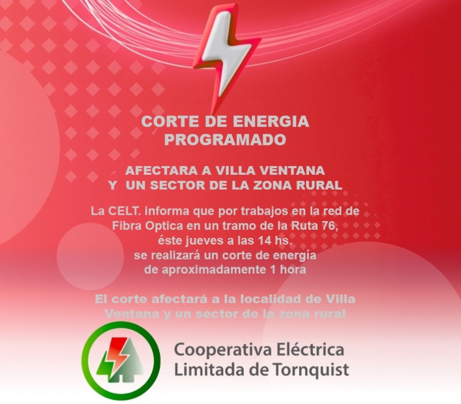 Leer másDetailsSerá este jueves 2 de octubre y afectará a Villa Ventana y un sector de zona rural.