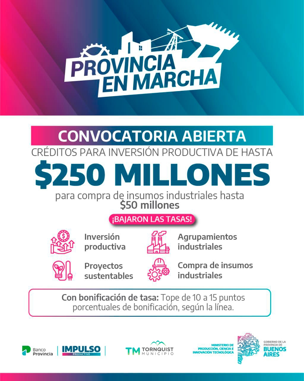 Se trata de préstamos con bonificación de tasas de interés del Ministerio de Producción, Ciencia e Innovación Tecnológica de la Provincia de Buenos Aires, destinados exclusivamente a Industrias:
